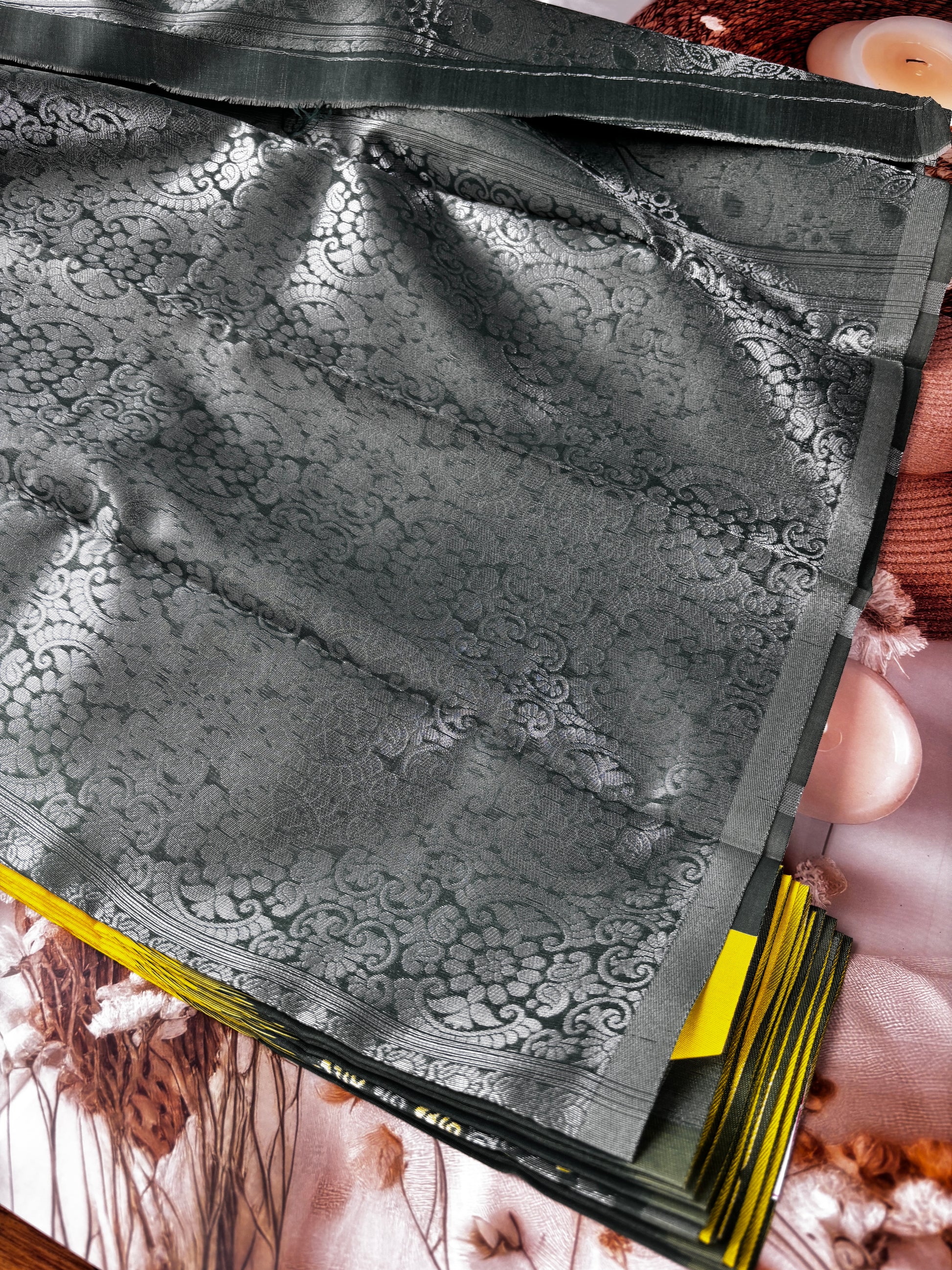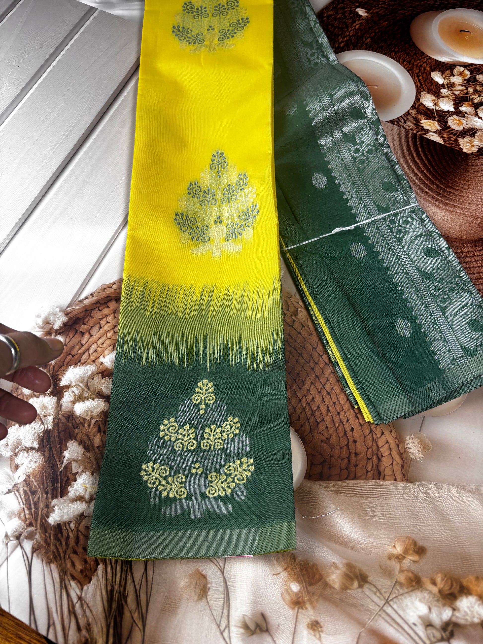 The saree features a vivid yellow body gracefully paired with a rich bottle green pallu and border, adorned with intricate tree-inspired motifs symbolizing growth and prosperity. Crafted from premium soft silk, it drapes beautifully with a smooth, lightweight finish — perfect for festive occasions, temple visits, or wedding rituals.