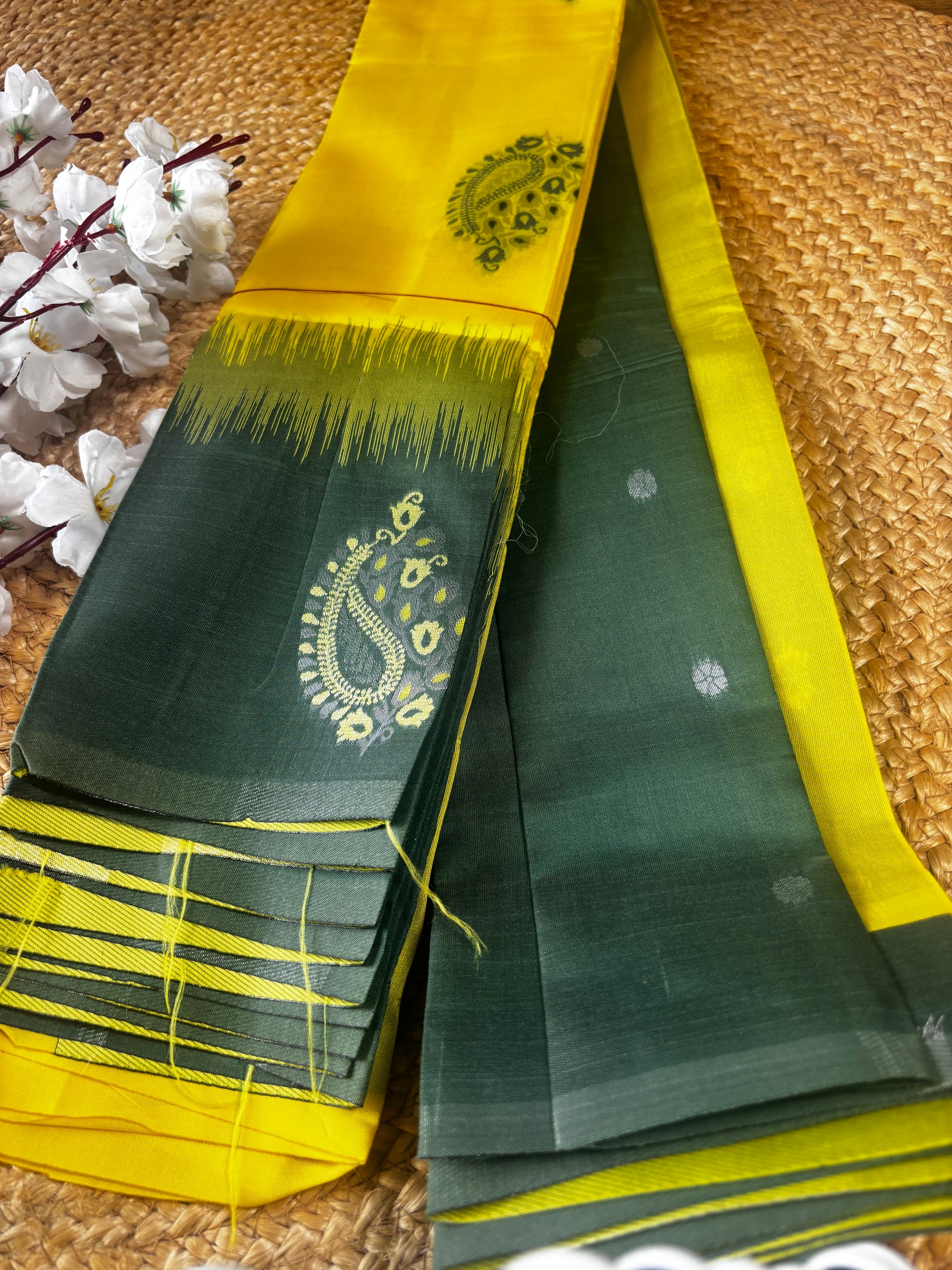 The saree features a vivid yellow body gracefully paired with a rich bottle green pallu and border, adorned with intricate tree-inspired motifs symbolizing growth and prosperity. Crafted from premium soft silk, it drapes beautifully with a smooth, lightweight finish — perfect for festive occasions, temple visits, or wedding rituals.