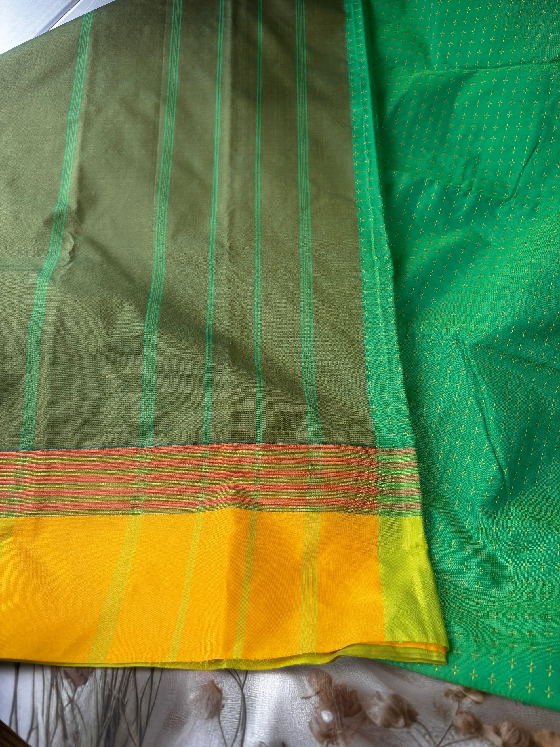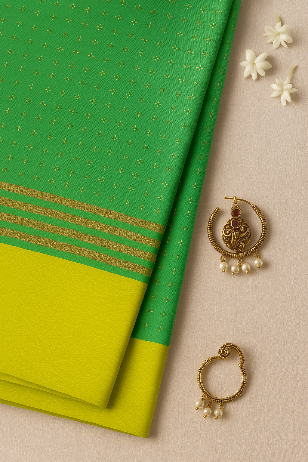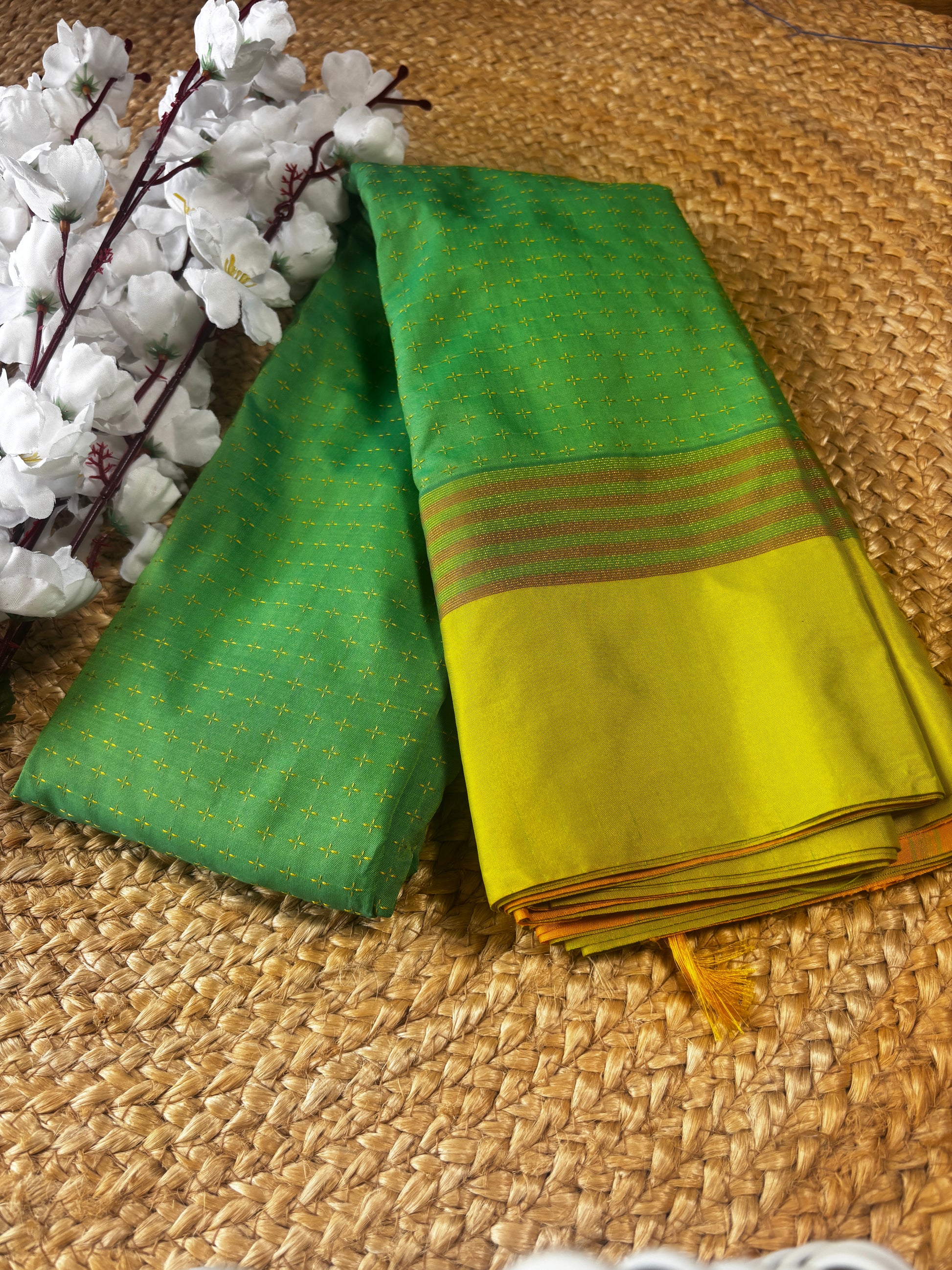 The saree features a vibrant green body beautifully adorned with delicate golden thread motifs, paired with a contrasting yellow border and pallu that add a radiant glow.